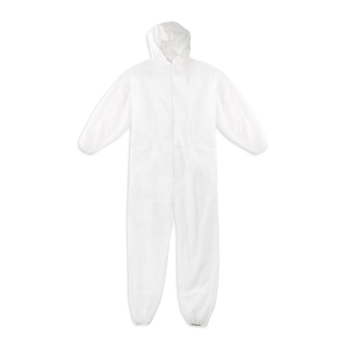 In polipropilene 40 gr/m2, completa di cappuccio con elastico, cerniera lampo nella parte
