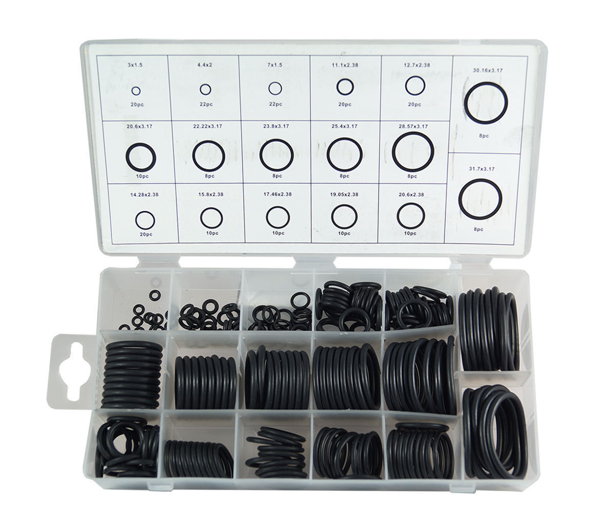 Set assortito di guarnizioni tipo O-RING METRICHE,da 12 tagli differenti,ideali per tutti quei tipi di settori in cui questi gommini possono risultare molto utili per riparazioni e messe a punto.Il tutto fornito in una comoda valigetta in plastica.