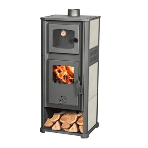 STUFA A LEGNA ACCIAIO VETRO 12 KW CON PORTALEGNA FORNO cm 48x42x117 BEIGE 248ro