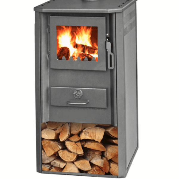 STUFA A LEGNA ACCIAIO VETRO 12 KW CON PORTALEGNA FORNO cm 48x42x117 ROSSO 170ro