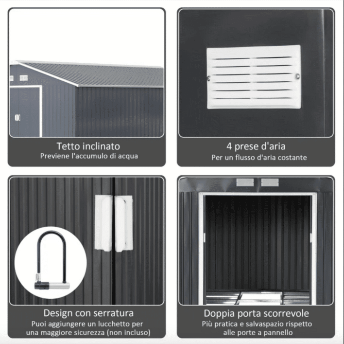 - BUONA VENTILAZIONE: Le quattro prese d’aria e le doppie porte scorrevoli di questa casetta da cortile aumentano la luce e il flusso d’aria, prevenendo gli odori sgradevoli e contribuendo a ridurre l’umidità nel capannone