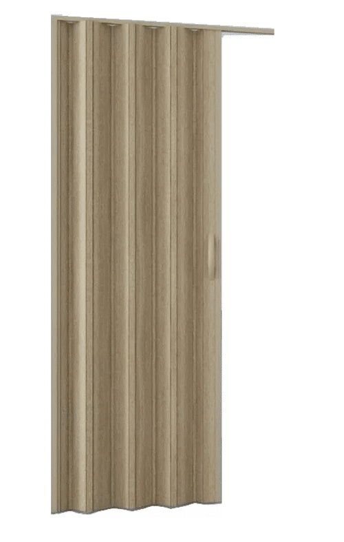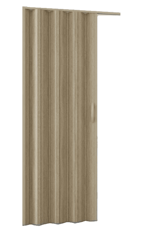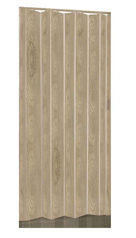 Questa porta a soffietto in PVC, rifinita in elegante effetto legno chiaro venato, è la soluzione ideale per ambienti in cui si desidera ottimizzare lo spazio senza rinunciare allo stile