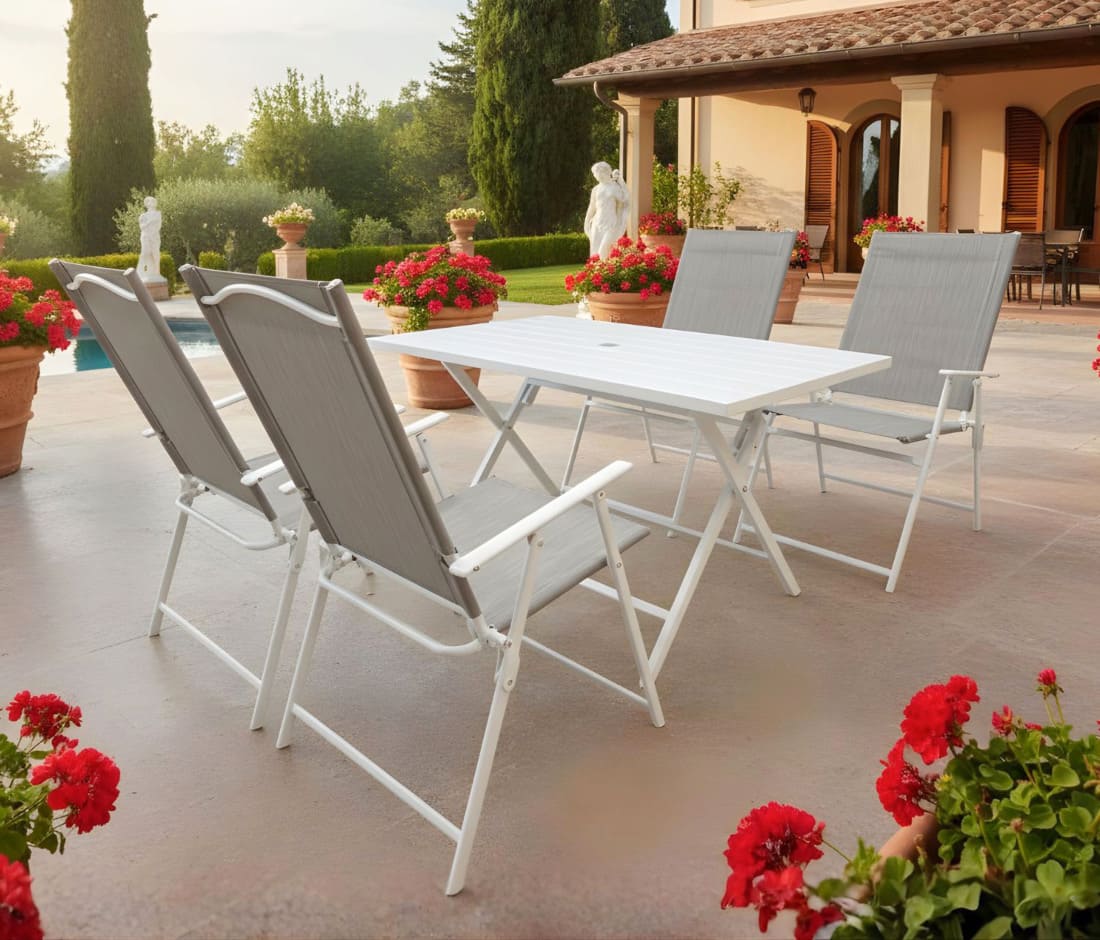 Set Pranzo da Giardino: Tavolo Rettangolare + 4 Sedie Pieghevoli in Textilene