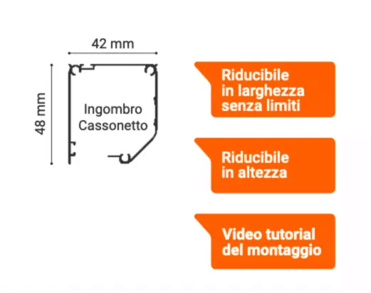 DIMENSIONI (LxH) : 115×230 cmINGOMBRO CASSONETTO: 42 x 48 mmRIDUCIBILE IN LARGHEZZA SENZA LIMITIRIDUCIBILE IN ALTEZZACON CHIUSURA A MAGNETE