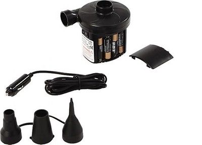 E’ fornita 3 attacchi di tipo universale per tutte le valvole dei gonfiabili, funziona a 12 Volt (attacco accendisigari) può essere attaccata alle prese domestiche attraverso un trasformatore 220/12v non compreso nella confezione