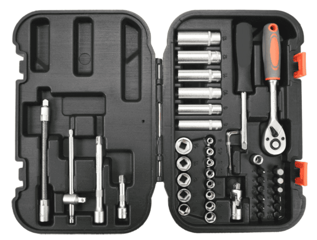 Il set comprende una gamma completa di attacchi da 1/4″, prolunghe, giunto cardanico e molti altri elementi, compreso un cricchetto a 45 denti