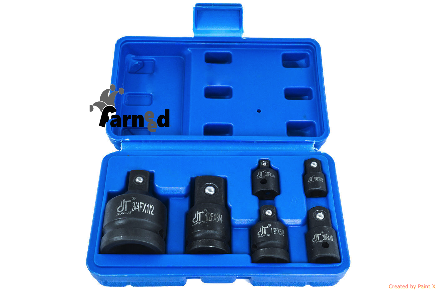 Set di 6 riduttori a bussola per tutti i tipi di strumenti ad impatto/aria compressa come chiave dinamometrica, avvitatore elettrico per pneumatici, ecc. Il set è fornito in custodia di plastica per un facile trasporto.
