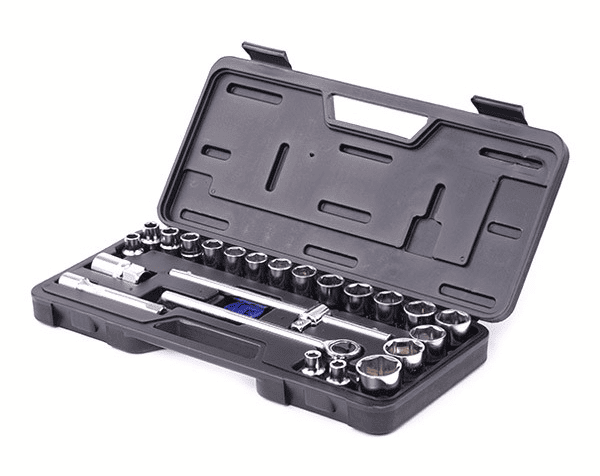 Il set si compone da 24 pezzi e una chiave a cricchetto da 1/2″, il tutto raccolto in un comodo contenitore in plastica