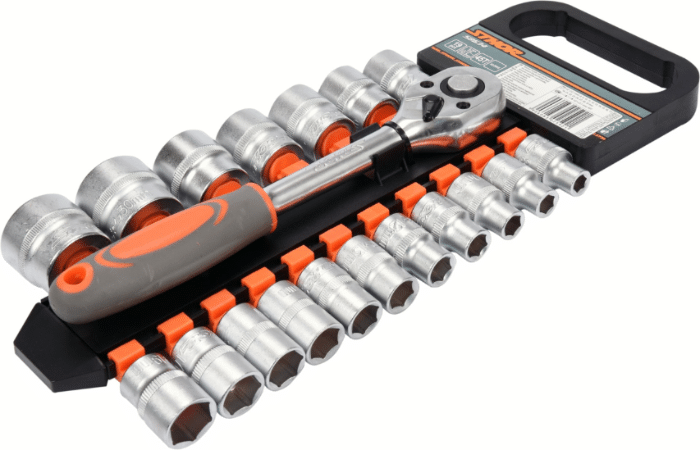 Il set si compone da 19 pezzi e una chiave a cricchetto da 1/2″, il tutto raccolto in un comodo raccoglitore in plastica