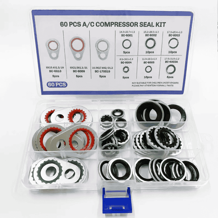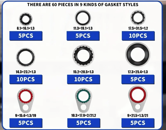 Pratico kit assortito da 60 guarnizioni per impianti di aria condizionata, ideale per interventi di manutenzione, riparazione e installazione su veicoli o impianti fissi