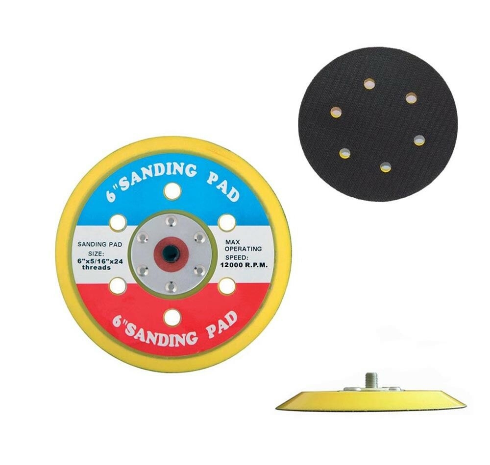 Platorello per levigatrici rotorbitale. Diametro 6″ – 150 mm, perno di fissaggio filettato 5/16″ – M8. Idoneo per dischi abrasivi con 6 fori di aspirazione e fissaggio