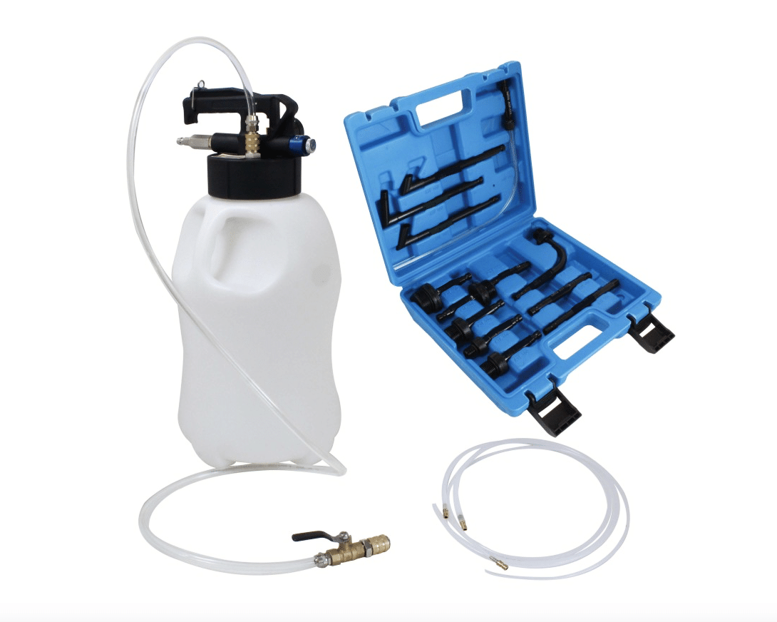 Pompa pneumatica con serbatoio da 10 litri, adatta per lo scarico e il riempimento dell'olio nei cambi automatici e nei differenziali parametri: · Pressione di esercizio 0-30 PSI · Ingresso aria da 1/4″ · Il set comprende 13 adattatori per un'ampia gamma di modelli con cambio automatico · La pompa può essere utilizzata per fluido differenziale, olio trasmissione, liquido servosterzo, olio motore, olio cambio, oli lubrificanti, liquido freni e liquido refrigerante